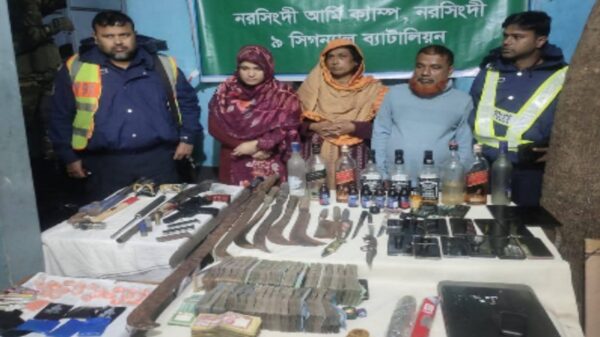 মোঃ আলম মৃধা : নরসিংদীর শিবপুর উপজেলা পুটিয়া ইউনিয়ন এর কারারচর ও আয়ুবপুর ইউনিয়ন এর জাঙ্গালিয়া এলাকায় সেনাবাহিনীর যৌথ অভিযানে বিপুল পরিমাণ অস্ত্র, মাদক, নগদ টাকাসহ ৭ জনকে গ্রেপ্তার করেছে যৌথবাহিনী। আজ (১৪ ফেব্রুয়ারি) বুধবার উদ্ধারকৃত অস্ত্র, মাদকদ্রব্য, নগদ অর্থ,